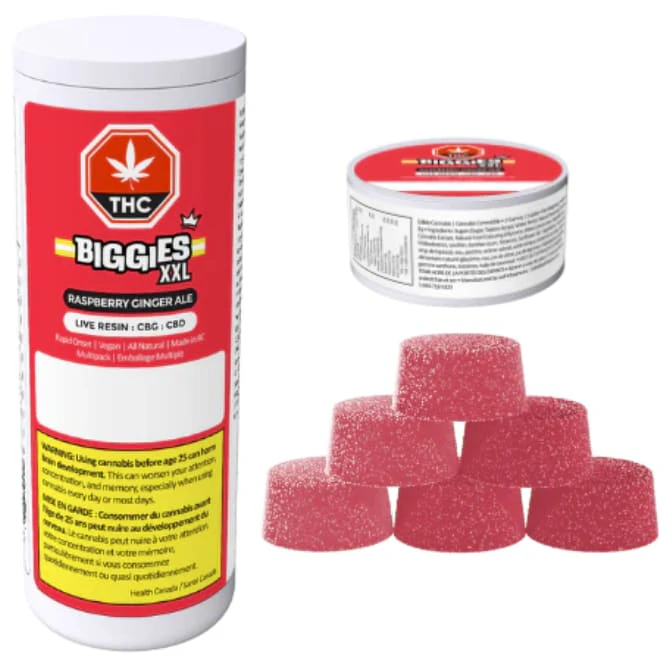 Premium, rapid onset, live resin, high-quality BIGGIES. This multi-pack of six single gummies feature, THE BIG ONE’S, which are 8g oversized gummies with a total of 10mg THC (live resin), 30mg CBG, 30mg CBD per individual gummy equaling a total of 60mg of THC, 180mg CBG, and 180mg CBD per master container utilizing their Ice Cream Cake x Gelato #33 strain. This flavour profile features a refreshing, crisp, and clean taste of ginger ale paired with a delicious twist of raspberry lemonade. The gummies are manufactured in-house using cannabis ingredients from British Columbia and are made with all-natural ingredients. Vegan, gluten-free, sulphite-free, and cannabis-terpene enhanced.