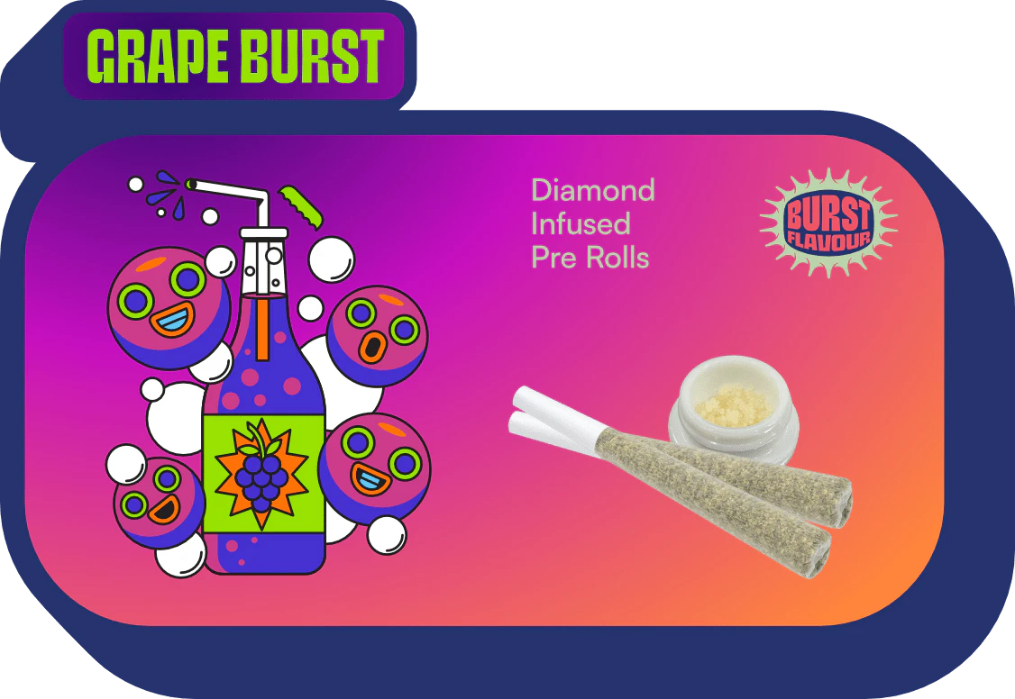 Rich, juicy, and packed with bold flavour, Grape Burst Infused Pre-Rolls deliver smooth, flavorful hits with sweet grape notes and a potent, terpene-rich experience. Crafted with premium flower and infused for an extra kick, these pre-rolls offer a smooth burn and a powerful, flavorful session every time.